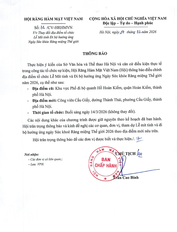 Thực hiện ý kiến của Sở Văn hóa và Thể thao Hà Nội và căn cứ điều kiện thực tế trong công tác tổ chức sự kiện, Hội Răng Hàm Mặt Việt Nam (Hội) thông báo điều chỉnh địa điểm tổ chức Lễ Mít tinh và Đi bộ hưởng ứng Ngày Sức khỏe Răng miệng Thế giới năm 2026, cụ thể như sau:
